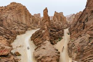 (250717) -- KUQA, 17 julio, 2025 (Xinhua) -- Vista aérea tomada con un dron de turistas visitando un cañón cerca...
