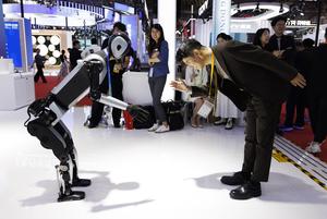 (250717) -- BEIJING, 17 julio, 2025 (Xinhua) -- Un periodista interactúa con un robot en el pabellón de la provincia...