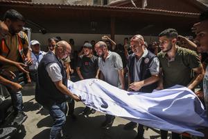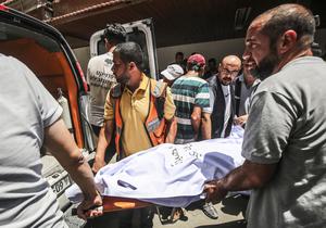 (250717) -- GAZA, 17 julio, 2025 (Xinhua) -- Palestinos trasladan el cuerpo de una víctima tras un ataque israelí con...