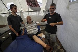 (250717) -- GAZA, 17 julio, 2025 (Xinhua) -- Un palestino herido recibe atención médica tras un ataque israelí con dron...