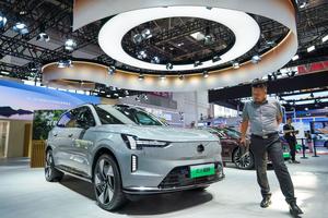 (250717) -- BEIJING, 17 julio, 2025 (Xinhua) -- Un visitante se informa sobre un vehículo en el estand de Volvo...