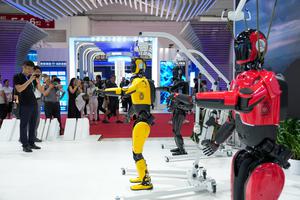 (250717) -- BEIJING, 17 julio, 2025 (Xinhua) -- Visitantes observan la presentación de un robot humanoide en el área de...