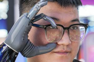 (250717) -- BEIJING, 17 julio, 2025 (Xinhua) -- Un empleado de la empresa tecnológica BrainCo usa una mano protésica inteligente...