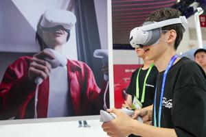 (250717) -- BEIJING, 17 julio, 2025 (Xinhua) -- Un visitante prueba un producto en el estand de Qualcomm en el...