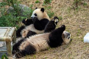 (250717) -- CHENGDU, 17 julio, 2025 (Xinhua) -- Dos cachorros de la panda gigante Xidou se acuestan en el suelo...