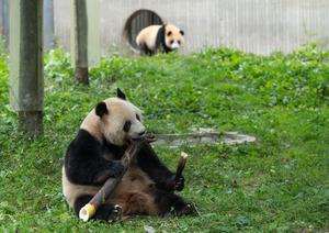 (250717) -- CHENGDU, 17 julio, 2025 (Xinhua) -- La panda gigante Fubao come bambú en la base Shenshuping de la...