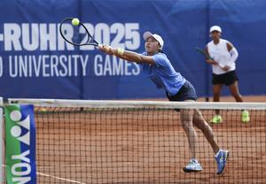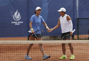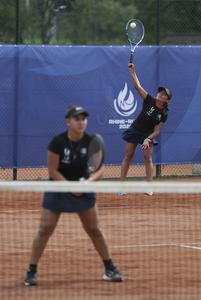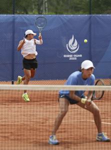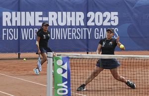 (250719) -- ESSEN, 19 julio, 2025 (Xinhua) -- Aiko Coballasy Lardizábal/Fátima Daniela Núñez Chagoya (d) compiten durante el partido de...
