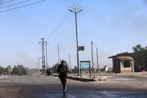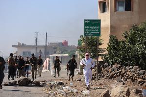 (250719) -- SWEIDA, 19 julio, 2025 (Xinhua) -- Imagen del 18 de julio de 2025 de un combatiente beduino corriendo...