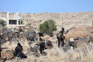 (250719) -- SWEIDA, 19 julio, 2025 (Xinhua) -- Imagen del 18 de julio de 2025 de combatientes tribales cubriéndose durante...