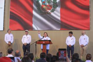 (250717) -- REGION AREQUIPA, 17 julio, 2025 (Xinhua) -- Imagen proveída por la Presidencia de Perú de la presidenta peruana, Dina Boluarte (c), hablando durante la inauguración de la Central Solar Fotovoltaica "San Martín", en la región Arequipa, Perú, el 17 de julio de 2025. Boluarte aseguró el jueves que su Gobierno continúa comprometido en impulsar proyectos que promuevan el uso de energías renovables en el país, tras inaugurar en la región Arequipa la Central Solar Fotovoltaica "San Martín". (Xinhua/Presidencia de Perú) (jg) (ah) (ce)