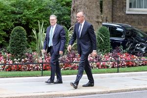 (250717) -- LONDRES, 17 julio, 2025 (Xinhua) -- El primer ministro británico, Keir Starmer (i), y el canciller alemán, Friedrich Merz, llegan al número 10 de Downing Street, en Londres, Reino Unido, el 17 de julio de 2025. Starmer y Merz firmaron el jueves un amplio acuerdo bilateral que abarca varias áreas incluida la defensa y la migración, que se cree que es el tratado más importante entre Reino Unido y Alemania desde el final de la Segunda Guerra Mundial. (Xinhua) (rtg) (ra) (ce)