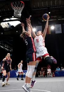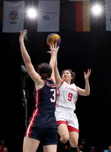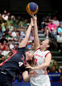 (250720) -- BOCHUM, 20 julio, 2025 (Xinhua) -- Zhang Tao (d), de China, salta para anotar mientras Talya Ann Brugler,...