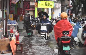 (250720) -- HAIKOU, 20 julio, 2025 (Xinhua) -- Personas montan motocicletas a través de un área inundada, en Haikou, en...
