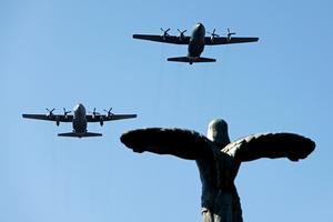 (250720) -- BUCAREST, 20 julio, 2025 (Xinhua) -- Aviones militares sobrevuelan la Estatua de los Héroes del Aire durante las...