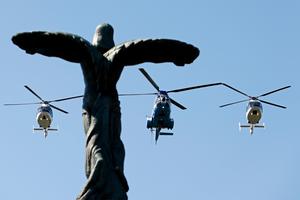 (250720) -- BUCAREST, 20 julio, 2025 (Xinhua) -- Helicópteros militares sobrevuelan la Estatua de los Héroes del Aire durante las...