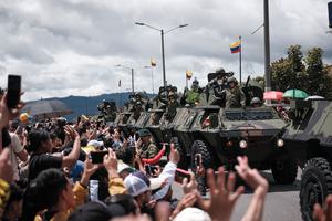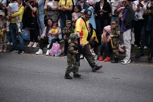 (250720) -- BOGOTA, 20 julio, 2025 (Xinhua) -- Un hombre y un niño participan en el desfile militar para conmemorar...