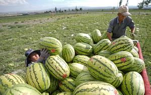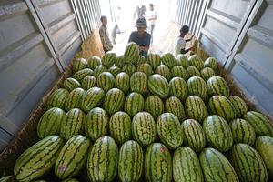 (250721) -- ZHONGWEI, 21 julio, 2025 (Xinhua) -- Imagen del 20 de julio de 2025 de comerciantes cargando sandías Xisha...