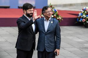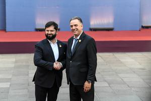 (250721) -- SANTIAGO, 21 julio, 2025 (Xinhua) -- El presidente chileno, Gabriel Boric (i), recibe al presidente colombiano, Gustavo Petro...