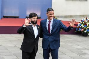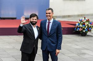 (250721) -- SANTIAGO, 21 julio, 2025 (Xinhua) -- El presidente chileno, Gabriel Boric (i), recibe al presidente del Gobierno español,...