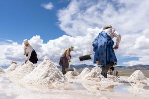 (250721) -- NGARI, 21 julio, 2025 (Xinhua) -- Imagen del 20 de julio de 2025 de pastores cosechando sal, en...