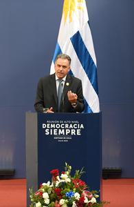 (250721) -- SANTIAGO, 21 julio, 2025 (Xinhua) -- El presidente uruguayo, Yamandú Orsi, participa durante una declaración conjunta ante los...