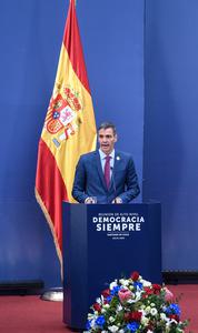 (250721) -- SANTIAGO, 21 julio, 2025 (Xinhua) -- El presidente del Gobierno español, Pedro Sánchez, participa durante una declaración conjunta...