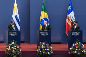 (250721) -- SANTIAGO, 21 julio, 2025 (Xinhua) -- El presidente uruguayo, Yamandú Orsi (i), el presidente brasileño, Luiz Inácio Lula...
