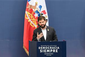 (250721) -- SANTIAGO, 21 julio, 2025 (Xinhua) -- El presidente chileno, Gabriel Boric, participa durante una declaración conjunta ante los...