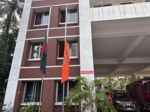 (250722) -- DHAKA, 22 julio, 2025 (Xinhua) -- Imagen del 22 de julio de 2025 de banderas arriadas a media...
