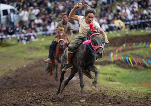 (250722) -- BUTUO, 22 julio, 2025 (Xinhua) -- Imagen del 21 de julio de 2025 de personas compitiendo con caballos...