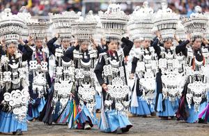 (250722) -- BUTUO, 22 julio, 2025 (Xinhua) -- Personas vestidas con trajes tradicionales del grupo étnico Yi desfilan en la...