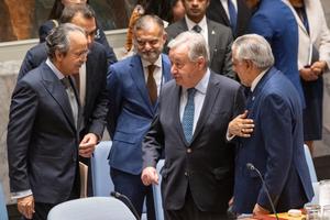 (250722) -- NACIONES UNIDAS, 22 julio, 2025 (Xinhua) -- El secretario general de la ONU, António Guterres (2-d-frente), habla con...