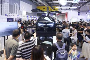 (250723) -- SHANGHAI, 23 julio, 2025 (Xinhua) -- Visitantes aprenden sobre un vehículo volador en la Exposición Internacional de Movilidad...
