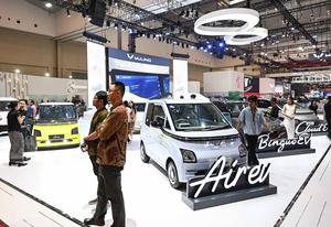 (250723) -- TANGERANG, 23 julio, 2025 (Xinhua) -- Personas visitan el estand de la marca de automóviles china Wuling durante...