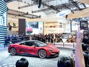 (250723) -- TANGERANG, 23 julio, 2025 (Xinhua) -- Personas visitan el estand de la marca de automóviles china Denza durante...