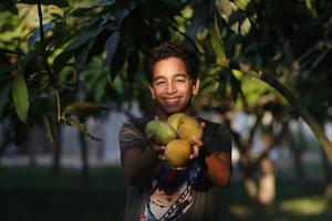 (250723) -- ISMAILIA, 23 julio, 2025 (Xinhua) -- Imagen del 22 de julio de 2025 de un agricultor mostrando mangos...