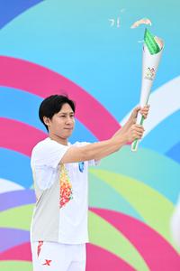 (250726) -- CHENGDU, 26 julio, 2025 (Xinhua) -- El portador de la antorcha, Han Cong, sostiene la antorcha durante el...