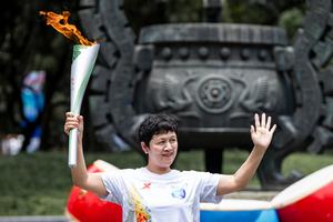 (250726) -- CHENGDU, 26 julio, 2025 (Xinhua) -- La portadora de la antorcha, Zhang Juanjuan, sostiene la antorcha durante el...