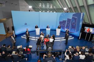 (250724) -- FRANKFURT, 24 julio, 2025 (Xinhua) -- La presidenta del Banco Central Europeo, Christine Lagarde (c-atrás), asiste a una conferencia de prensa, en Frankfurt, Alemania, el 24 de julio de 2025. El Banco Central Europeo (BCE) anunció el jueves que mantendrá sin cambios las tasas de interés clave en su última reunión de fijación de tasas. (Xinhua/BCE) (da) (ra) (vf)
