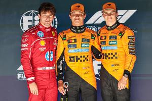 (250727) -- STAVELOT, 27 julio, 2025 (Xinhua) -- Imagen del 26 de julio de 2025 del ganador de la pole position, el piloto británico de la escudería McLaren, Lando Norris (c), posando con el ganador del segundo lugar, el piloto australiano de la escudería McLaren, Oscar Piastri (d), y el ganador del tercer lugar, el piloto monegasco de la escudería Ferrari, Charles Leclerc (i), durante la ceremonia de premiación de la sesión de clasificación del Gran Premio de Bélgica de Fórmula Uno, en el circuito de Spa-Francorchamps, en Stavelot, Bélgica. (Xinhua/Qian Jun) (rtg) (da)