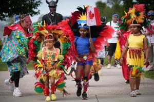 (250727) -- COQUITLAM, 27 julio, 2025 (Xinhua) -- Imagen del 26 de julio de 2025 de niñas portando disfraces mientras participan en el Desfile de Carnaval en el Festival Días del Caribe 2025, en Coquitlam, Columbia Británica, Canadá. El evento de dos días contó con música en vivo, presentaciones culturales, un desfile, cocina tradicional caribeña, y un mercado de artesanías, resaltando la vitalidad de la cultura caribeña. (Xinhua/Liang Sen) (rtg) (ah)