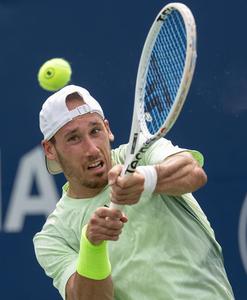 (250727) -- TORONTO, 27 julio, 2025 (Xinhua) -- Imagen del 26 de julio de 2025 de Kyrian Jacquet, de Francia, devolviendo la pelota durante el partido de clasificación de individuales masculinos entre Juan Pablo Ficovich, de Argentina, y Kyrian Jacquet, de Francia, en el torneo de tenis Abierto National Bank 2025, en Toronto, Canadá. (Xinhua/Zou Zheng) (oa) (da)