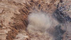 (250727) -- JIXIAN, 27 julio, 2025 (Xinhua) -- Vista aérea tomada por un dron el 27 de julio de 2025 de personas visitando la cascada Hukou en el río Amarillo, en el distrito de Jixian, en la provincia de Shanxi, en el norte de China. La cascada Hukou está experimentando un aumento del caudal de agua últimamente. (Xinhua/Liu Hongda) (oa) (da)