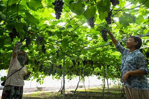 (250725) -- TIANJIN, 25 julio, 2025 (Xinhua) -- Imagen del 24 de julio de 2025 de agricultoras cosechando uvas en el Parque de Ciencia y Tecnología de la Uva de Chadian, en el subdistrito de Chadian, en la Nueva Area de Binhai, en Tianjin, en el norte de China. Chadian ha acelerado el cultivo estandarizado de la uva para mejorar tanto el rendimiento como la calidad de las uvas, e incrementar los ingresos de los agricultores. (Xinhua/Zhao Zishuo) (jg) (da) (vf)