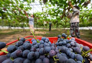 (250725) -- TIANJIN, 25 julio, 2025 (Xinhua) -- Imagen del 24 de julio de 2025 de uvas recién cosechadas vistas en el Parque de Ciencia y Tecnología de la Uva de Chadian, en el subdistrito de Chadian, en la Nueva Area de Binhai, en Tianjin, en el norte de China. Chadian ha acelerado el cultivo estandarizado de la uva para mejorar tanto el rendimiento como la calidad de las uvas, e incrementar los ingresos de los agricultores. (Xinhua/Zhao Zishuo) (jg) (da) (vf)