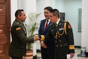 (250726) -- BOGOTA, 26 julio, 2025 (Xinhua) -- Imagen del 25 de julio de 2025 de un delegado de las Fuerzas Militares de Colombia estrechando la mano del agregado de Defensa de China, Zhou Yi (d), junto al embajador de China en Colombia, Zhu Jingyang (c), durante una recepción por el 98° aniversario de la fundación del Ejército Popular de Liberación de China, en la ciudad de Bogotá, capital de Colombia. La Embajada de China en Colombia celebró la noche del viernes el 98° aniversario de la fundación del Ejército Popular de Liberación de China con una recepción a la que asistieron representantes del cuerpo diplomático acreditado, funcionarios del Gobierno y delegados de las Fuerzas Militares de Colombia, así como empresarios de ambos países. (Xinhua/Andrés Moreno) (am) (jg) (da)