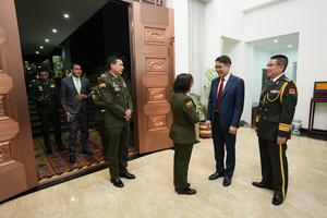 (250726) -- BOGOTA, 26 julio, 2025 (Xinhua) -- Imagen del 25 de julio de 2025 de delegados de las Fuerzas Militares de Colombia saludando al embajador de China en Colombia, Zhu Jingyang (2-d), y al agregado de Defensa de China, Zhou Yi (d), durante una recepción por el 98° aniversario de la fundación del Ejército Popular de Liberación de China, en la ciudad de Bogotá, capital de Colombia. La Embajada de China en Colombia celebró la noche del viernes el 98° aniversario de la fundación del Ejército Popular de Liberación de China con una recepción a la que asistieron representantes del cuerpo diplomático acreditado, funcionarios del Gobierno y delegados de las Fuerzas Militares de Colombia, así como empresarios de ambos países. (Xinhua/Andrés Moreno) (am) (jg) (da)