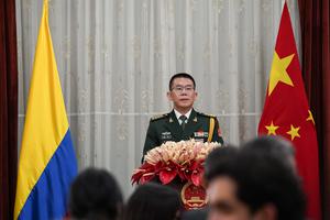 (250726) -- BOGOTA, 26 julio, 2025 (Xinhua) -- Imagen del 25 de julio de 2025 del agregado de Defensa de China, Zhou Yi, pronunciando un discurso durante una recepción por el 98° aniversario de la fundación del Ejército Popular de Liberación de China, en la ciudad de Bogotá, capital de Colombia. La Embajada de China en Colombia celebró la noche del viernes el 98° aniversario de la fundación del Ejército Popular de Liberación de China con una recepción a la que asistieron representantes del cuerpo diplomático acreditado, funcionarios del Gobierno y delegados de las Fuerzas Militares de Colombia, así como empresarios de ambos países. (Xinhua/Andrés Moreno) (am) (jg) (da)