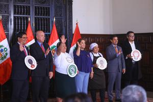 (250724) -- LIMA, 24 julio, 2025 (Xinhua) -- Imagen proveída por la Presidencia de Perú de la presidenta peruana, Dina Boluarte (c), encabezando la ceremonia de presentación de los Sellos Oficiales de Signos Distintivos Peruanos en el Palacio de Gobierno, en Lima, capital de Perú, el 24 de julio de 2025. Boluarte presentó oficialmente el jueves los Sellos Oficiales de Signos Distintivos Peruanos, una iniciativa para proteger y posicionar los productos emblemáticos del país sudamericano en los mercados nacionales e internacionales. (Xinhua/Presidencia de Perú) (jg) (vf)