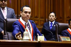 (250726) -- LIMA, 26 julio, 2025 (Xinhua) -- Imagen proveída por el Congreso de la República de Perú del legislador José Jerí (frente), del partido conservador Somos Perú, reaccionando durante su nombramiento como presidente del Congreso de Perú, en Lima, Perú, el 26 de julio de 2025. Jerí asumió el sábado la presidencia del Congreso peruano para el periodo legislativo 2025-2026, luego de que la lista que conformó su propuesta de Mesa Directiva obtuviera 79 votos a favor en una elección interna. (Xinhua/Congreso de la República de Perú) (oa) (da)